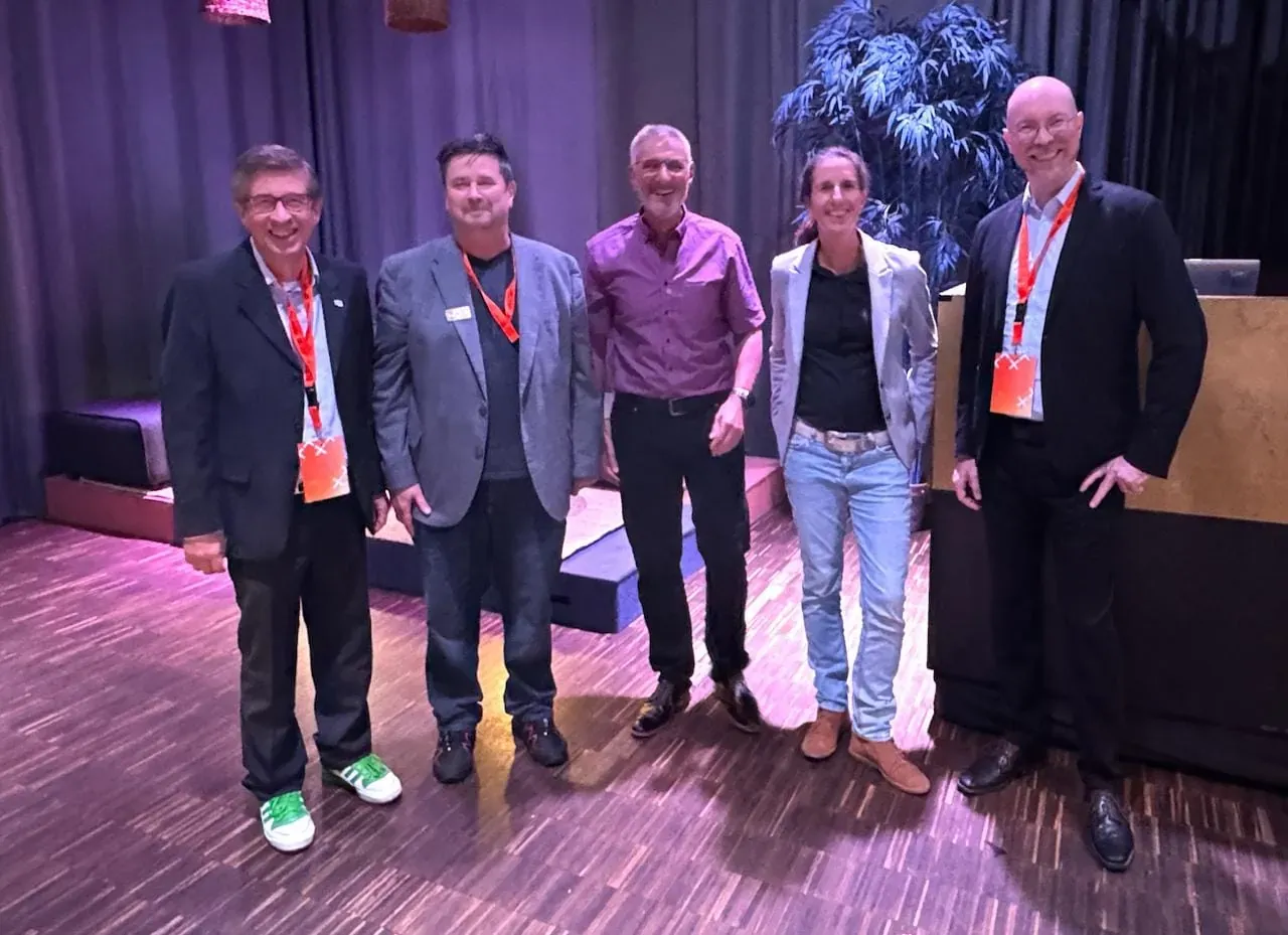 Freude in den Gesichtern nach den Wahlen der Jahrestagungen: (v.l.) Dr. Andreas Klingler (IHE Europe e.V.), Dr. Kai Heitmann (Geschäftsführer HL7 Deutschland e.V.), Dr. Jürgen Bosk (IHE-Vorstand / Co-Vendor-Chair), Gudrun Liß (IHE-Vorstand / Co-User-Chair), Dr. Danny Ammon (Vorstand HL7 Deutschland e.V.). – © Michael Reiter